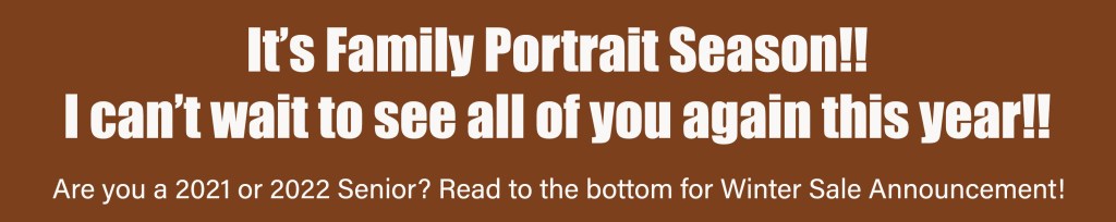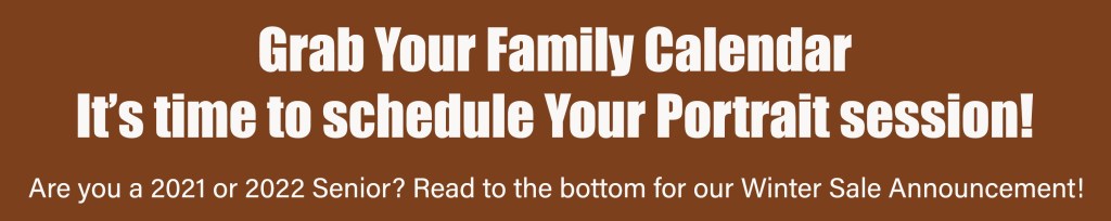 2021 Seniors! We have not forgotten about you! We have saved some valuable days to schedule your senior portrait session during the holiday breaks. We know school is busy and takes up most of your free time, so double check your schedule and contact us NOW so we can save you a date. The weather will probably be crisp and cool and perfect sweaters and jacket and winter boots.