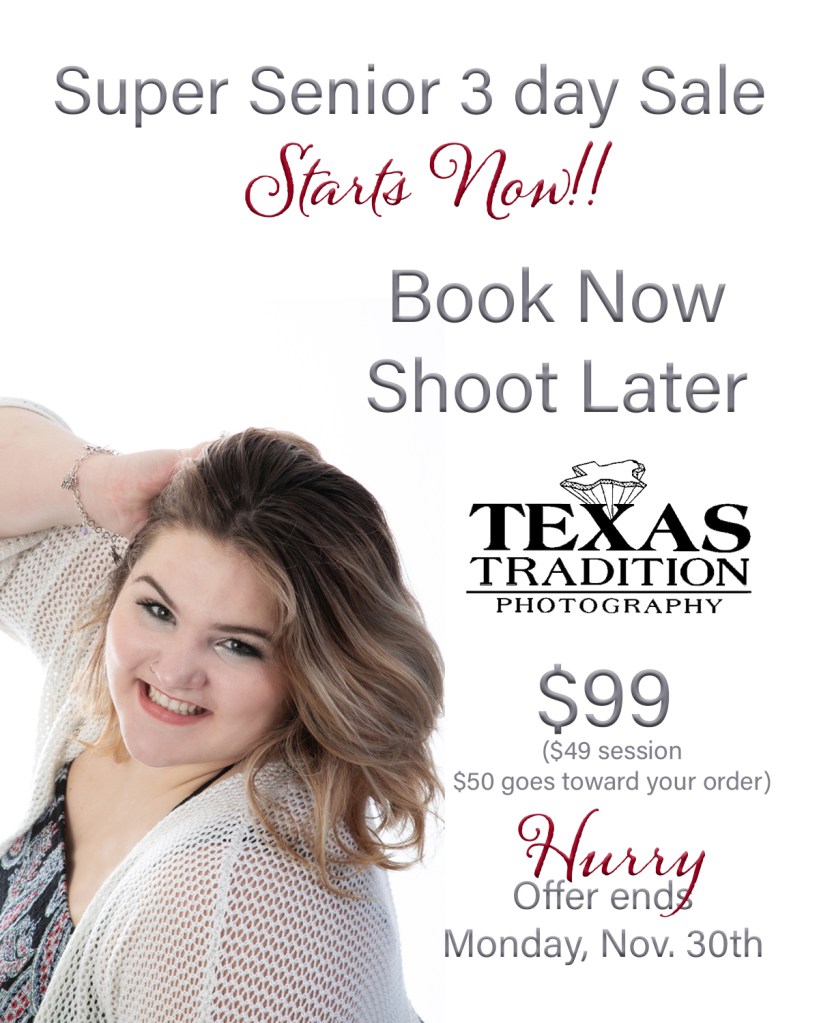 Let us know in the message section that you want to take advantage of our three day senior sale. We look forward to chatting with you. Hurry Book NOW, schedule your session for later. Do you prefer to talk to a real live person? Give us a call instead 972-492-2983.