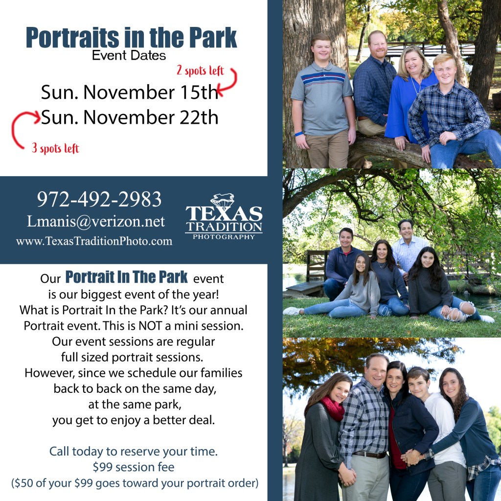 What are you waiting for? Click on the button below to email us your name, how many members in your family and the dates that work for you. We will contact you and chat about clothing, your family’s personalities and of course scheduling. Hurry, we have a limited amount of Portraits in the Park appointment times and they are filling up fast.