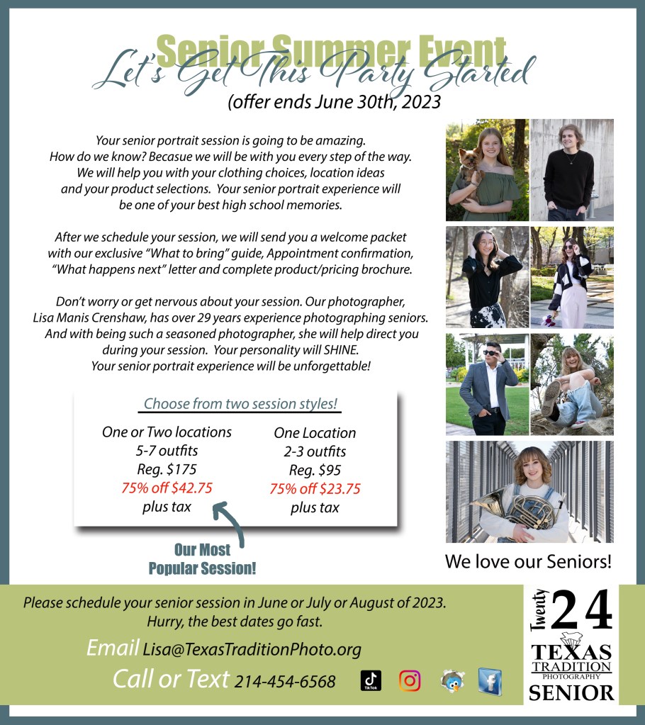 We’ve got an irresistible offer for you. We are giving away UNLIMITED sessions at this value from now until June 30th, 2023. The 75% off Senior Portrait Special will be our best event of the season. Plus, we will include our FREE custom social sharing phone app with all your ordered images. (value$140) Did I mention IRRESISTIBLE?