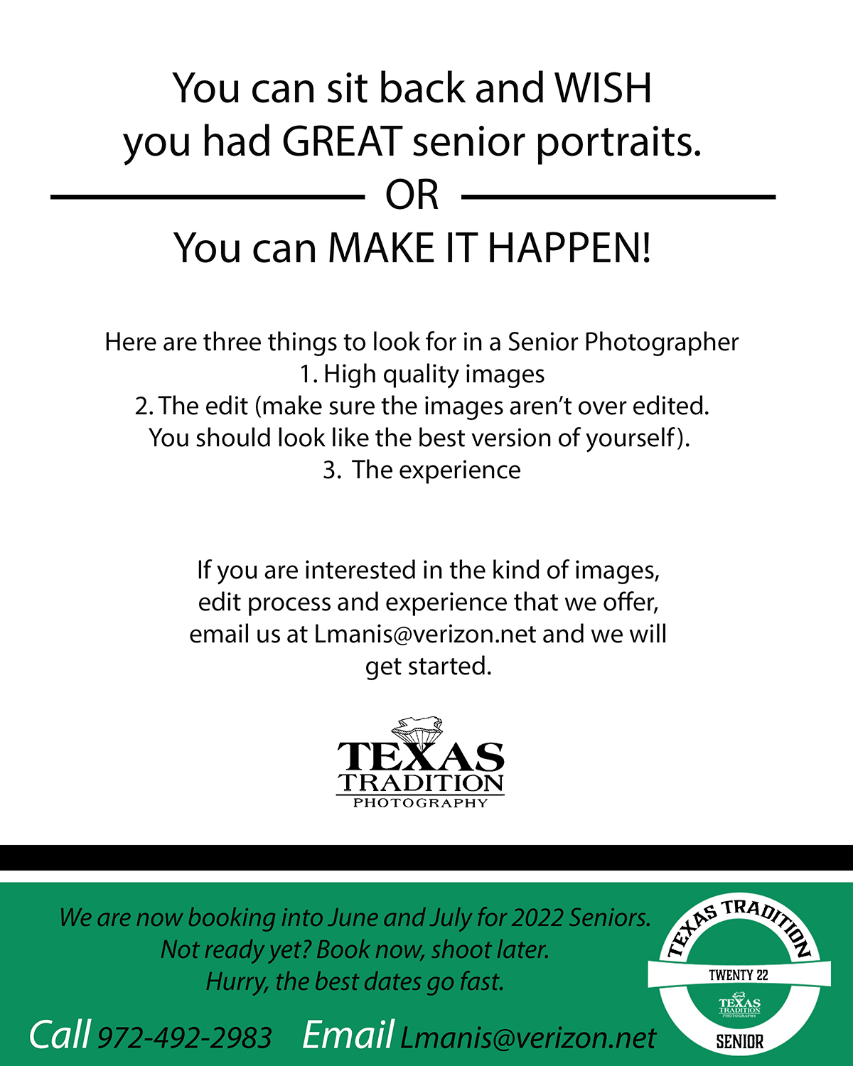 Book your senior session with Texas Tradition Photography between June and October of 2022