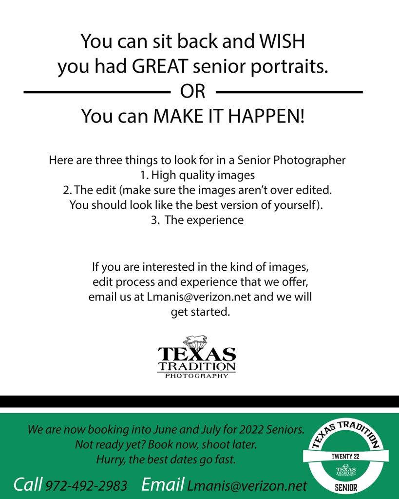 Use Texas Tradition Photography as your sole photographer during your senior year