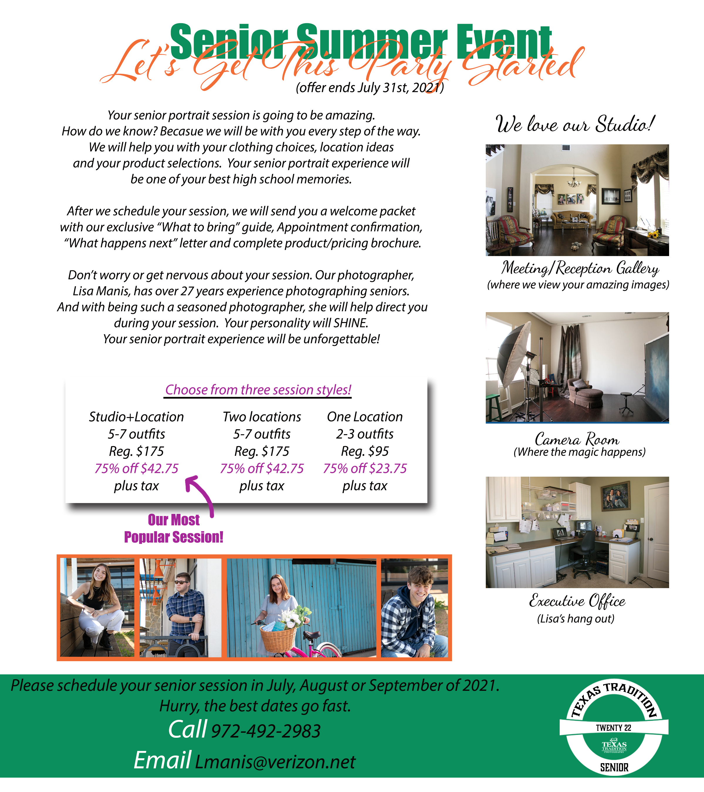 What next? I’m glad you asked. Right now is the best time to schedule your 2022 senior portrait session. We are launching our first and best 2022 senior portrait session special. It only runs until July 31st, 2021 and the best summer appointment times fill up fast.